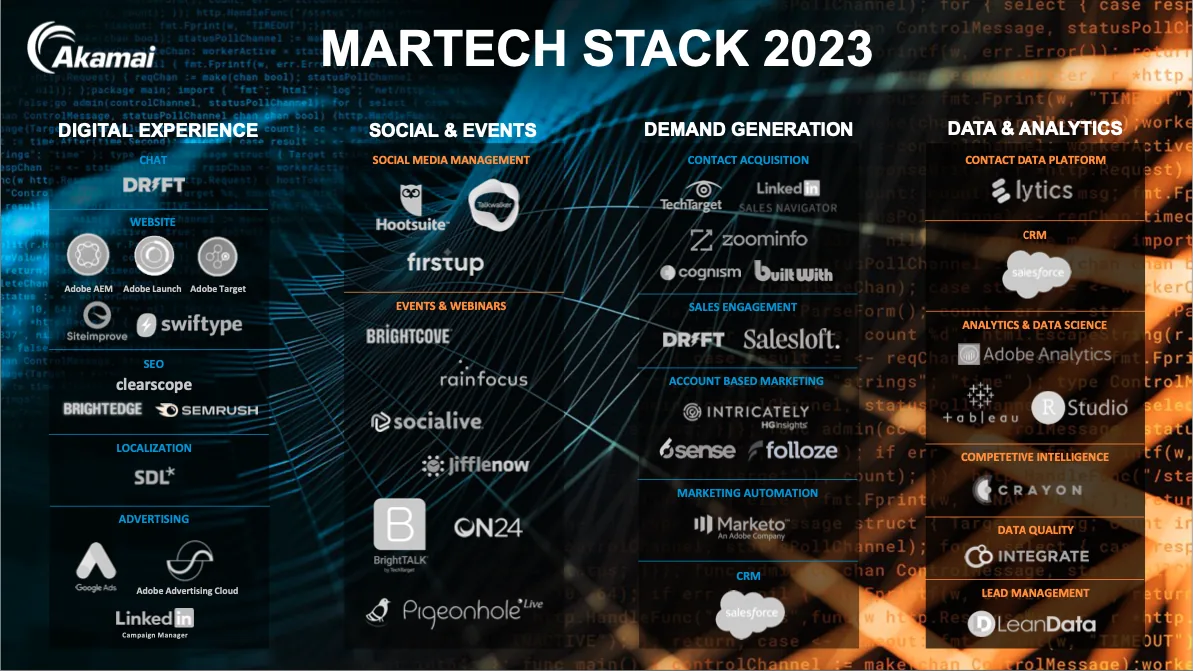 3) Not only do these selections of tools vary from company to company, but even the ways the tools are categorized vary. For example, Akamai uses four broad categories: Digital Experience, Social & Events, Demand Generation, and Data & Analytics; while IBM groups its tools into Planning & Operations, AdTech, Data, Automation & Audience, Digital, Content, Event, and Sales. So there’s no standard set of tools to use and there’s no set way to organize them either!