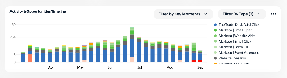 3) Single Account Journey Upgrade: Marketing and Sales activities come in all shapes and sizes. We noticed how low volume / high value Sales CRM activities can be hard to find in the account journey, so we optimized the chart to make these activities pop, alongside high volume marketing touchpoints.