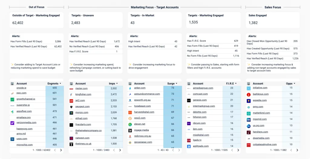2) Account Stages: Understand where each account stands in the buyer’s journey and receive actionable next steps for sales & marketing with our new “Account Stages” dashboard. This new categorization instantly showcases which accounts are out of target, unaware, in-market, marketing engaged, and sales engaged. Plus, exporting accounts in each stage for activation in platforms like LinkedIn or Bombora is a breeze!