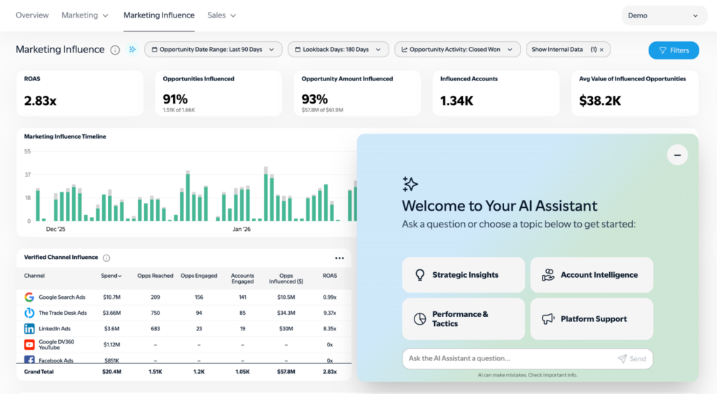 1) AI Assistant [Open Beta]: We’ve been steadily adding more and more features to our AI Assistant. The assistant can answer data questions in real time about campaigns, accounts and channels – and can write detailed summaries in seconds. The AI Assistant now lives on every page of the app and provides intelligent links directly into dashboards and reports, so you can drill down into any responses to see all the underlying data.